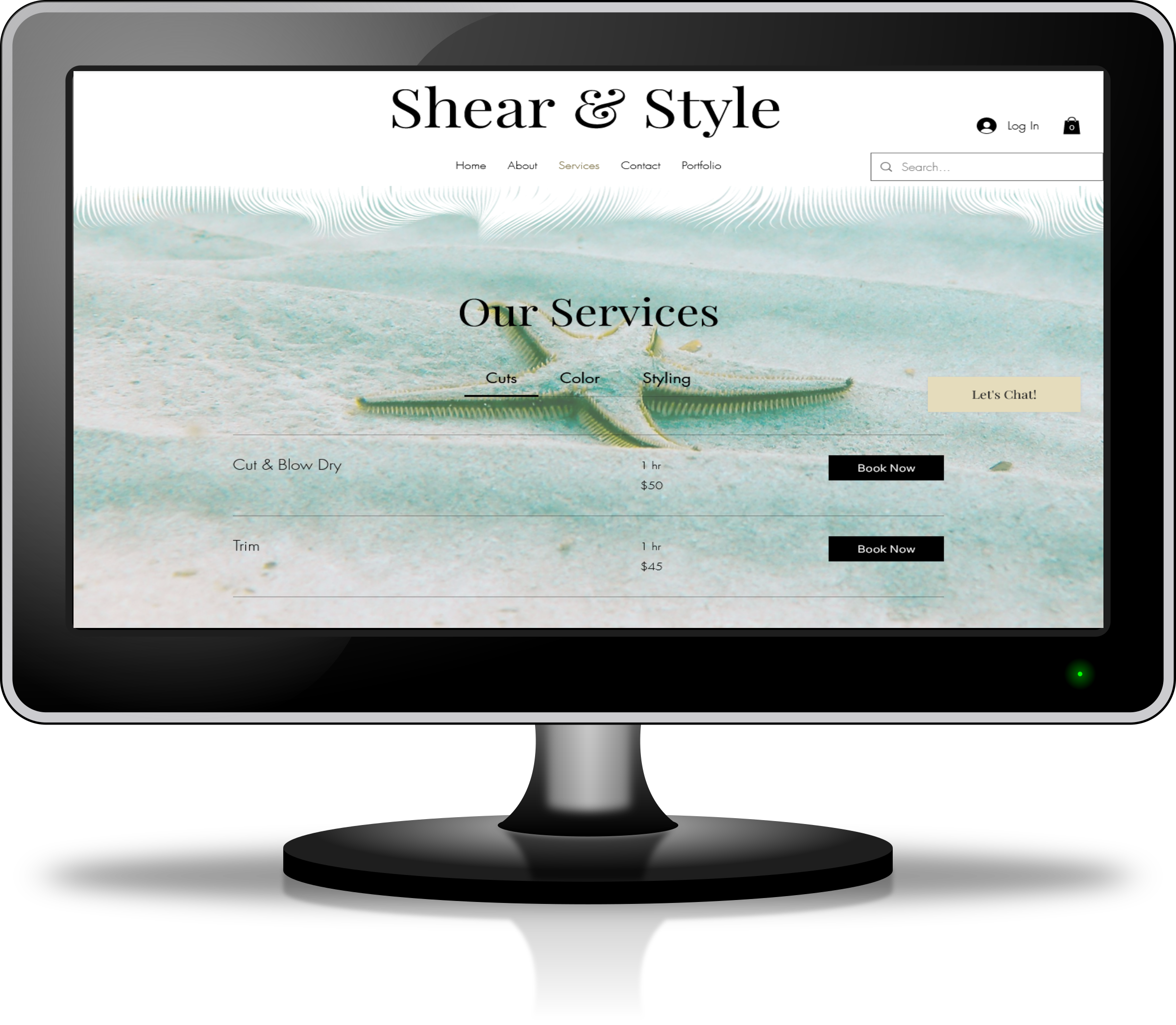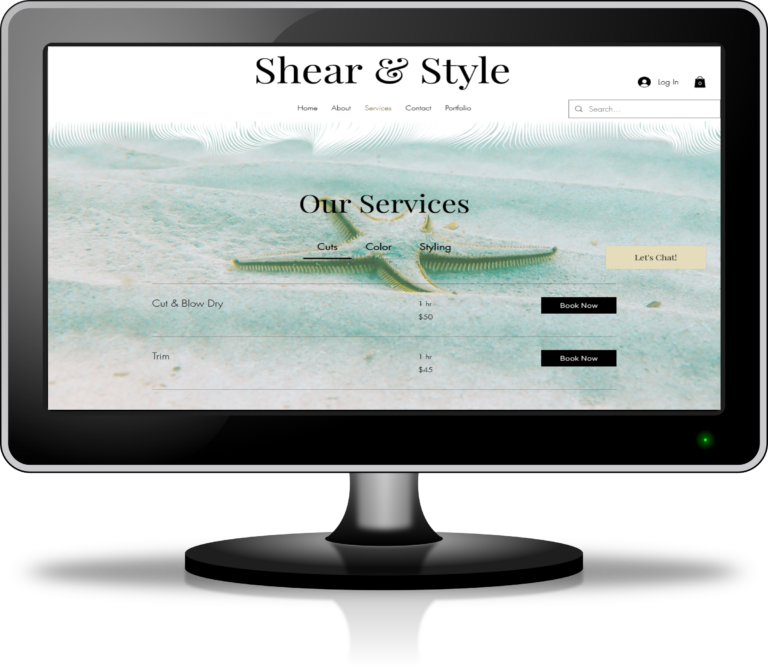 This enchanting beach themed website adorned with floating starfish and hair shape dividers is perfect for the sea loving hairstylist. Complete with a booking feature and a list of services it should be smooth sailing!